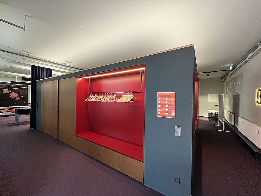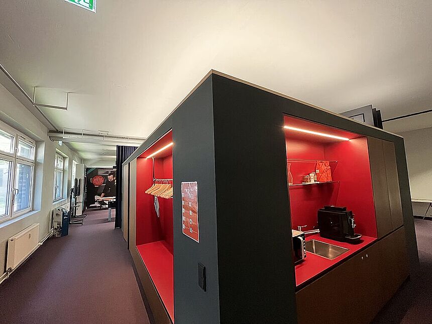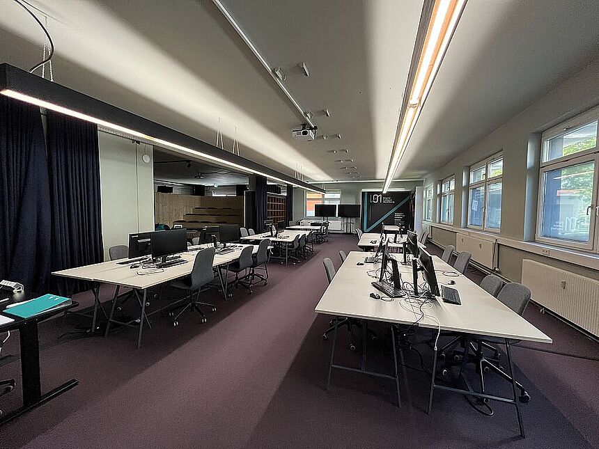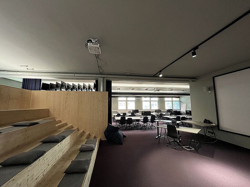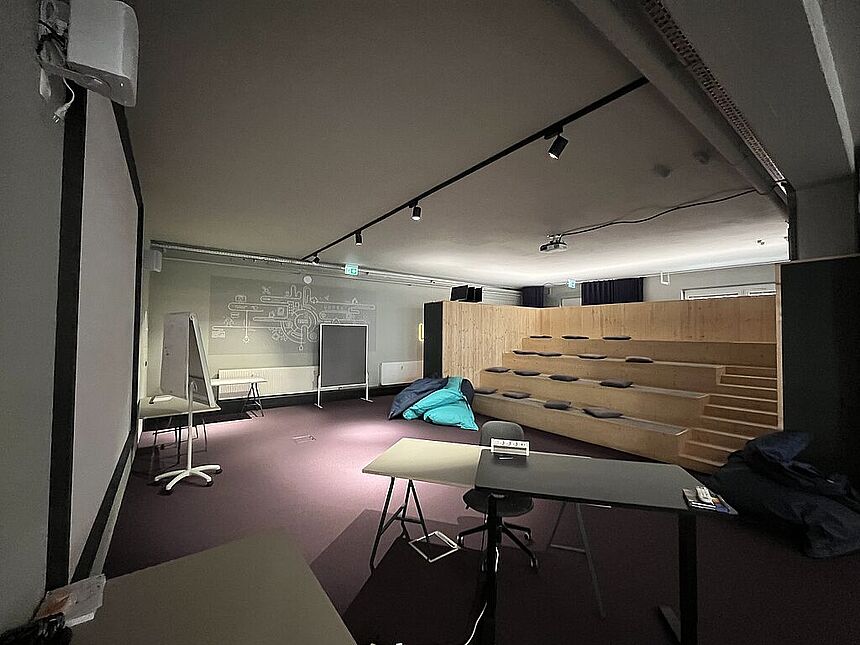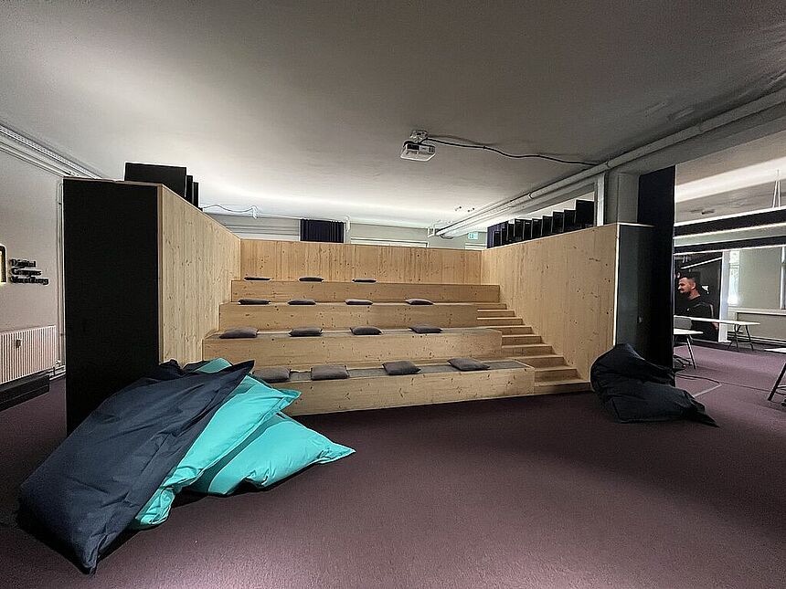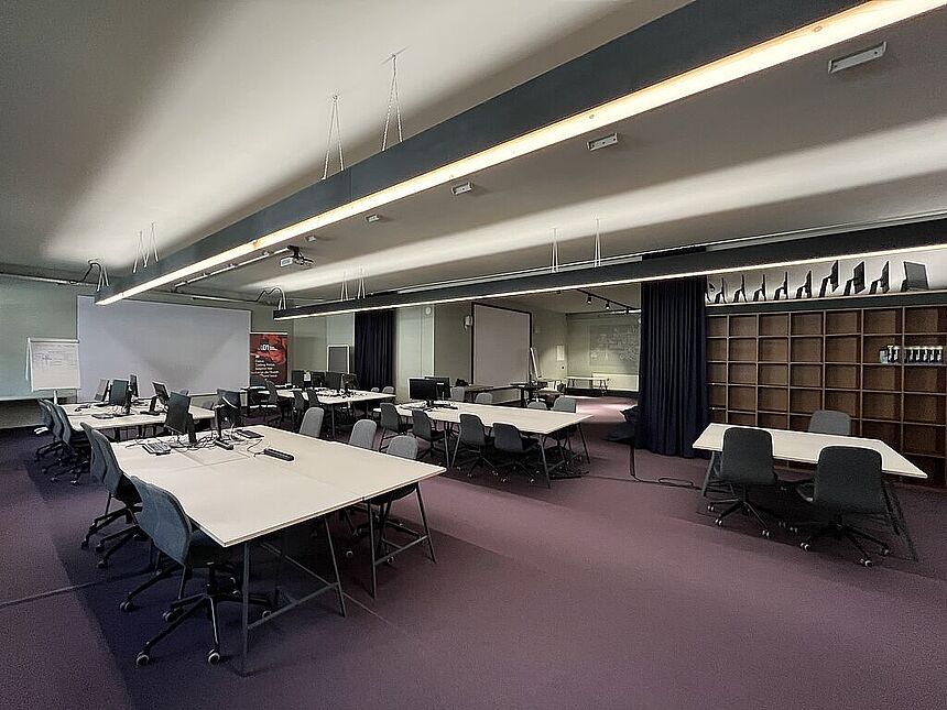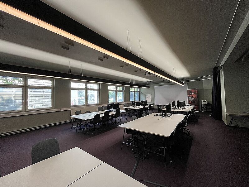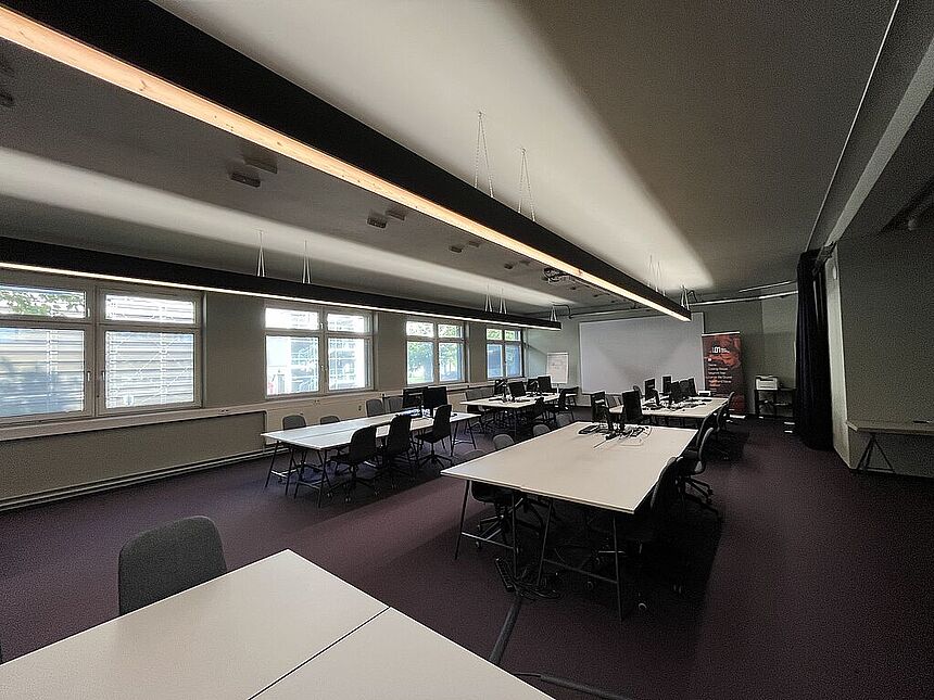 Ausstattung: Teppichboden / Außenbeschattung / Küchenblock mit Garderobe / tribünenartiges Sitzmöbel / Vorhangsystem / getrennte WC-Anlagen / EDV-Verkablung / indirekte Beleuchtung / elektrisches Zutrittssystem.
