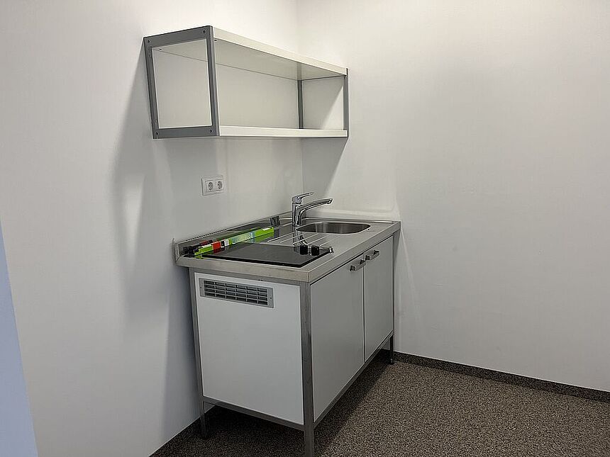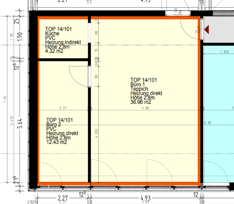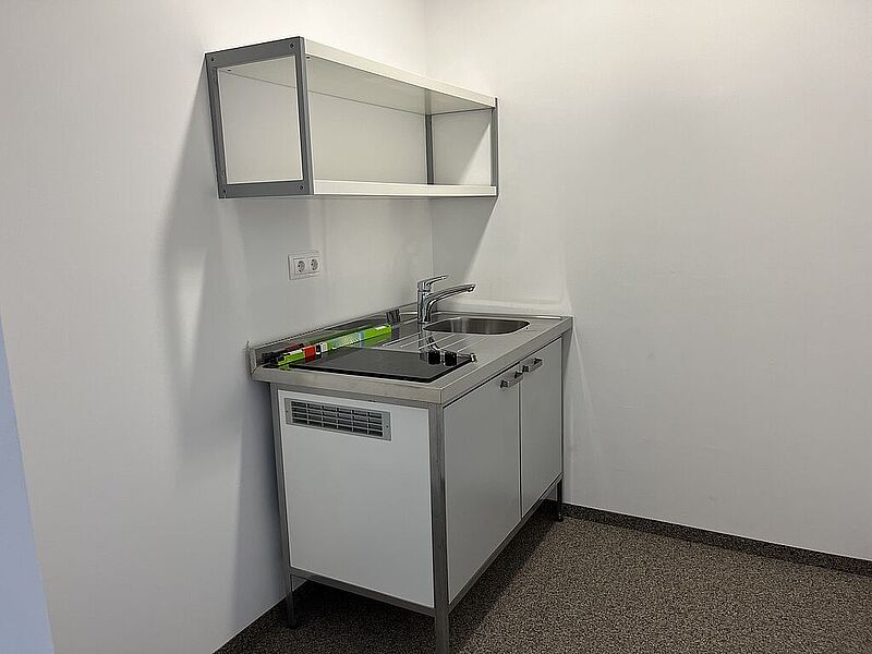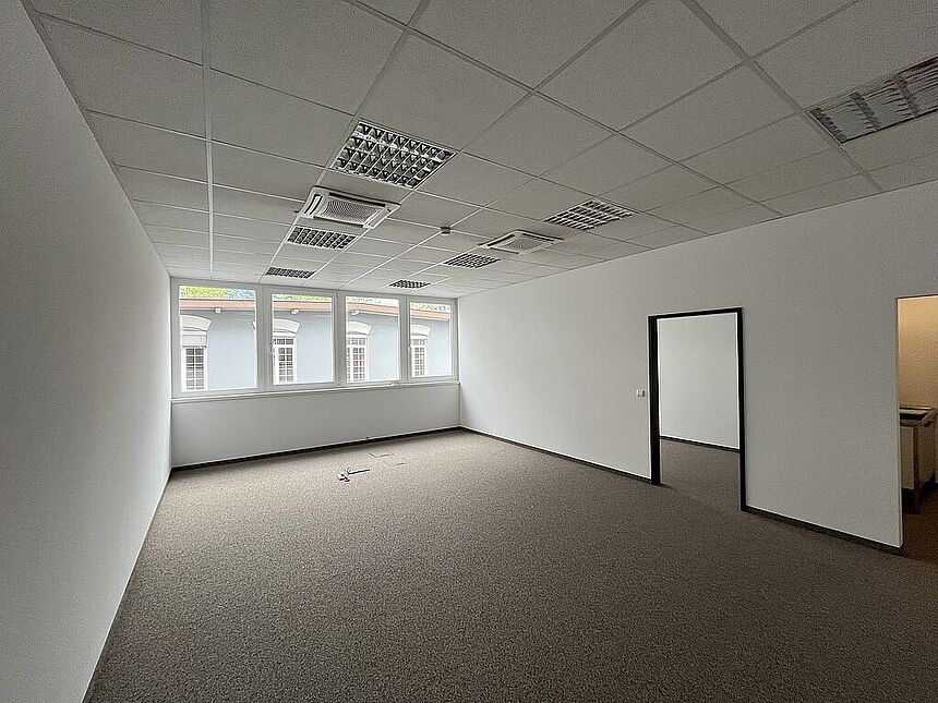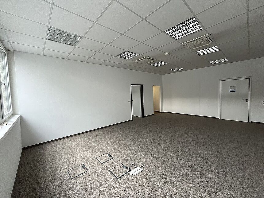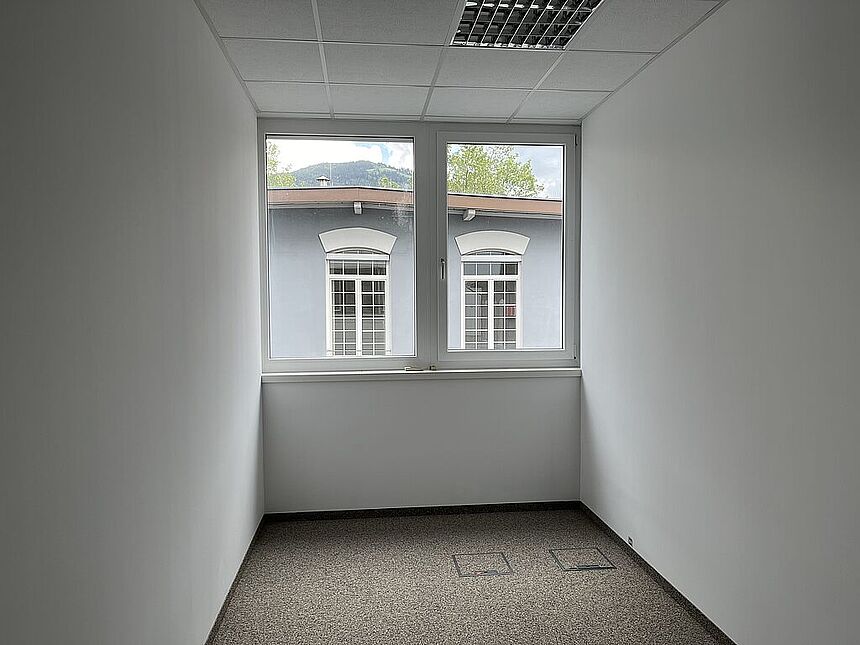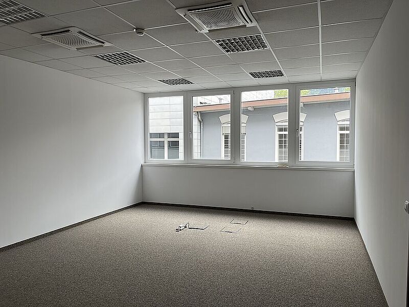 Büro im 1.OG über interne Stiege: 2,8 m Raumhöhe / Kügelgarn / Kühlung / Teeküche / EDV-Verkabelung über Bodendosen / elektr. Zutrittssystem.